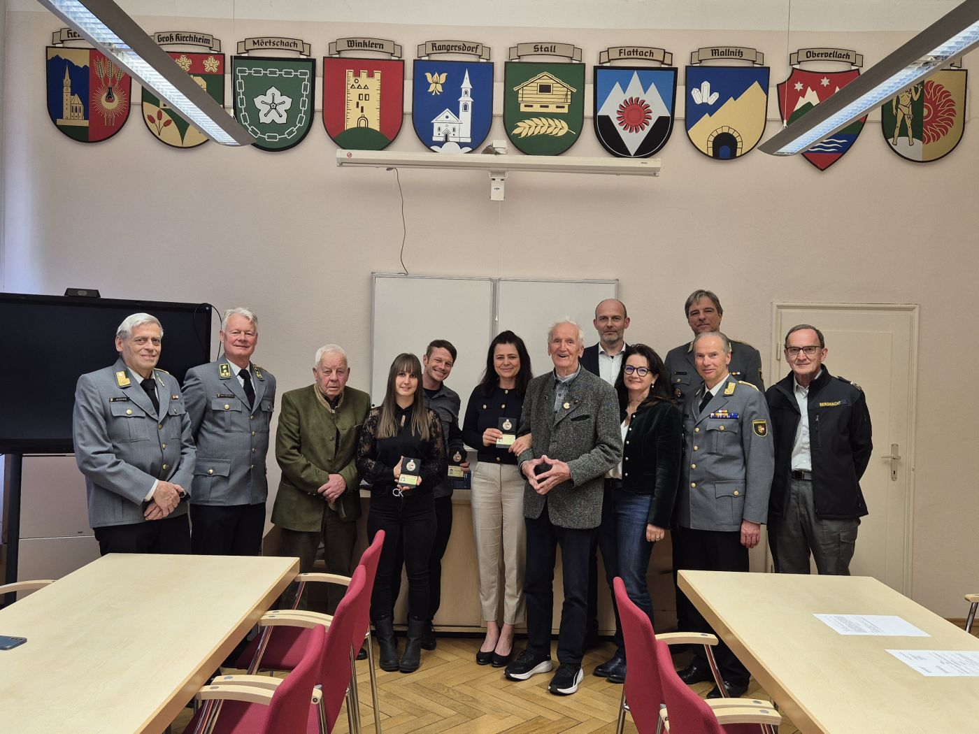 V. l.: Bezirksleiter Ernst Jeschke, Josef Weichselbraun jun. (Einsatzleiter Winklern), Josef Weichselbraun sen., Kathrin Fercher, Holger Brandl, Karoline Winkler, Ambros Unterkircher, Mag. Oliver Hanke, Mag. Sigrid Panser (Bereichsleiterin Bau- und Umwelt), Reg.Rat Hannes Hössl (Landesleiter Stv.), Mag. Johannes Leitner (Landesleiter), Franz Lassnig (Einsatzleiter-Stv. Stall).