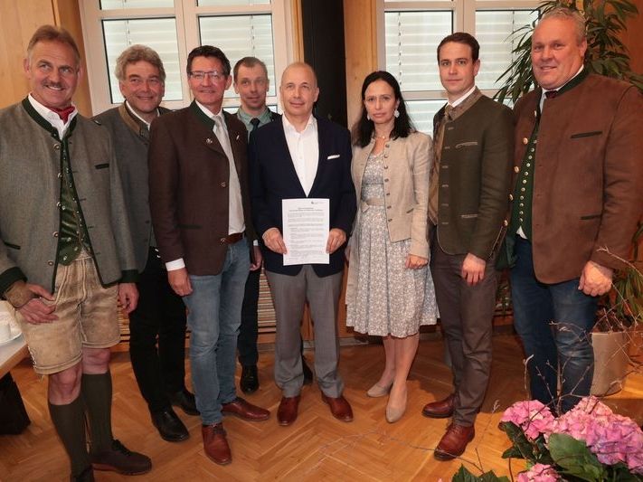 Übergabe des Positionspapiers an die APG. V. l.: Die KR Marijan Čik, Hermann Schluder, LK-Präsident Siegfried Huber, KR Franz Zarfl, DI Wolfgang Hafner (APG), die LK-Vizepräsidenten Astrid Brunner und Roman Linder sowie KR Franz Matschek. Foto: LK Kärnten/Wajand