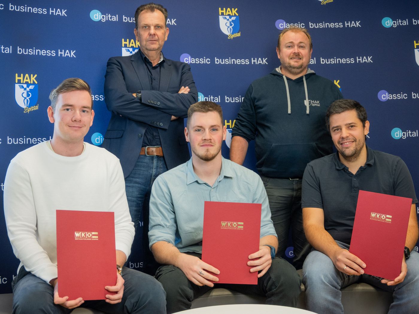 V. l.: Ing. Luca Velten, Ing. Martin Schrall, Ing. Christoph Ebner. Hinten: Direktor Reinhold Strobl, Prof. Thomas Enzi. Foto: Markus Seppele/HAK Spittal
