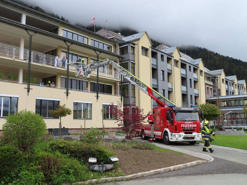 Die Drehleiter der Feuerwehr Hermagor war ebenfalls vor Ort, um die Evakuierung von Patienten aus den oberen Stockwerken zu üben. Die Zusammenarbeit zwischen dem Krankenhauspersonal, dem Roten Kreuz und der Feuerwehr funktionierte dabei ausgezeichnet. Davon überzeugten sich vor Ort unter anderen auch Mag. (FH) Patrik Zenaty von der Bezirkshauptmannschaft Hermagor, Bezirksrettungskommandant Martin Santner, Bürgermeister Mag. (FH) Josef Zoppoth, Gemeindefeuerwehrkommandant HBI Günther Martin, Pflegedirektor Markus Grollitsch, BA, Medizinischer Direktor Prim. Dr. Hüseyin Evren, Kaufmännischer Direktor Ing. Gebhard Schmied, MAS, OA Dr. Christian Potocnik und Projektleiterin Sonja Martin.