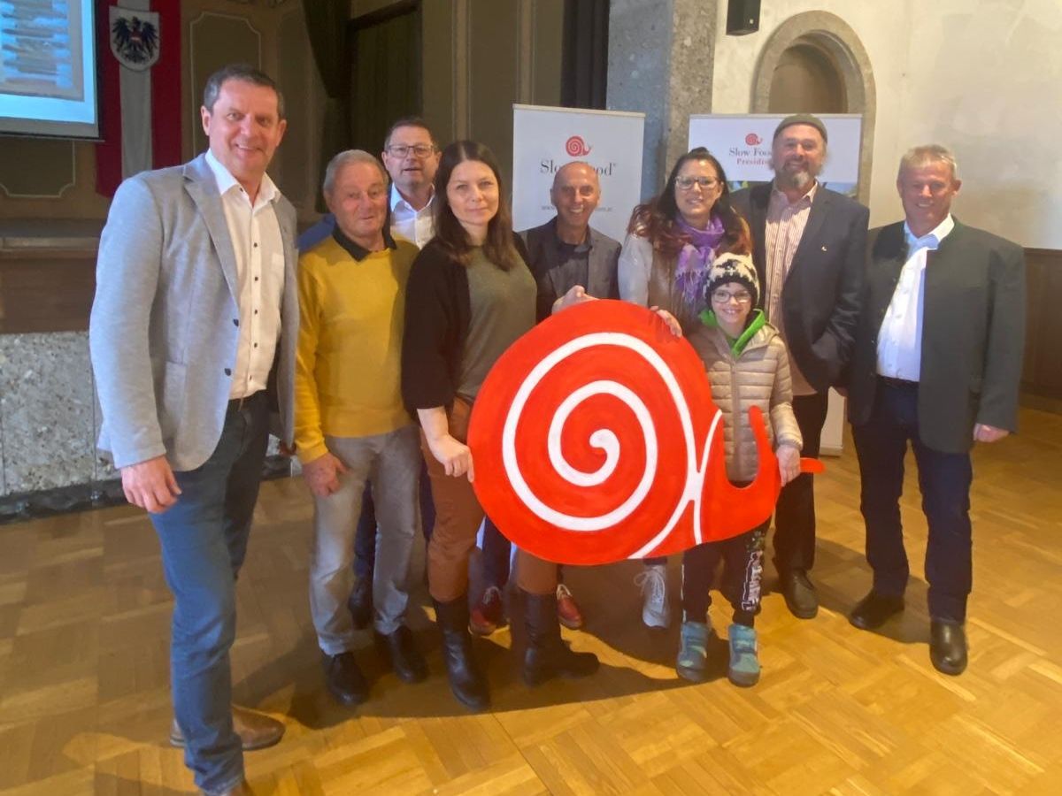 Thomas Schäfauer (Bürgermeister), Wolfgang Tölderer (Obmann Slow Food Village Seeboden), Hellmuth Koch (Leiter TVB Seeboden) Melanie Wiedl (Vortrangende), Eckart Mandler (Slow Food Kärntn), LR(in) Sara Schaar, Valentino (Neffe von Sara Schaar), Gottfried Bacher (Obmann Slow Food Kärnten), Horst Zwischenberger (GV und Initiator „gelber Spänling“). Fotos: Slow Food Gemeinschaft Seeboden.
