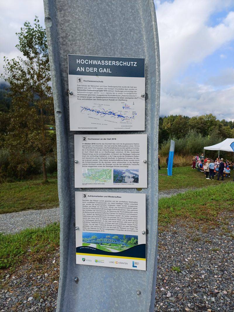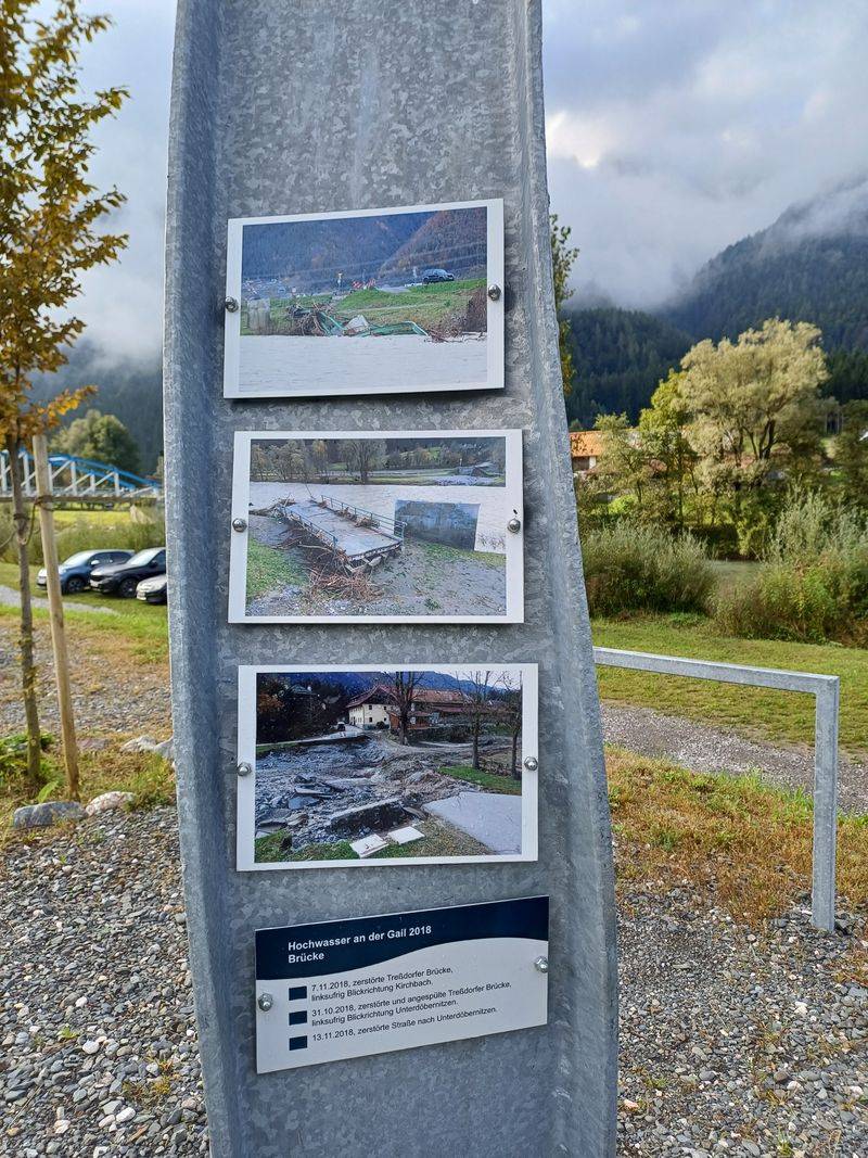 Dass man diese Kraft niemals aus den Augen verliert errichteten die Wasserwirtschaft-Unterabteilung Hermagor gemeinsam mit der Gemeinde Kirchbach nun einen Info-Platz „Hochwasser Gail 2018“ in der Nähe der Unterdöbernitzer Gailbrücke, die damals zur Gänze vom Hochwasser zerstört wurde. Die verbogenen und verformten Metallträger der alten Brücke wurden vom damaligen Bürgermeister Hermann Jantschgi nicht entsorgt sondern zurückbehalten und mahnen jetzt als „stählerne Zeugen“ vor der Kraft des Gailwassers. Die in die Erde gepflanzten, verformten Stahlträger zeigen Bilder von damaligen Ausmaß des Hochwassers und sind auch mit QR-Codes versehen, sodass Passanten Wissenswertes abrufen können.