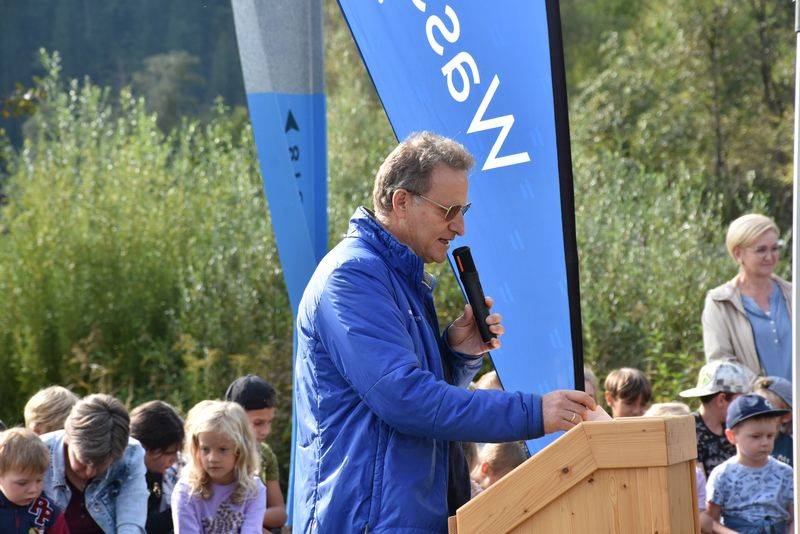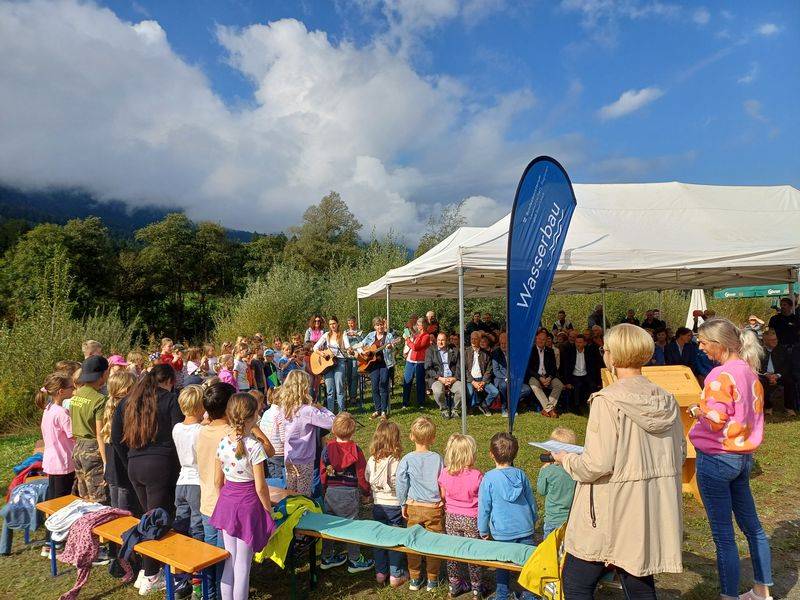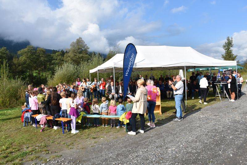 Vor allem für die jüngeren Generationen soll dieses Wissen erhalten bleiben. Deshalb haben Volksschule und Kindergarten die Einweihungsfeier mit Liedern und Gedichten umrahmt, welche die Kraft des Wassers zum Thema hatte. Die Begrüßung der Gäste übernahm Bürgermeister Markus Salcher, ein kurzer Vortrag zur Gail kam von Kärntens höchstem Wasserbauer DI Dr, Stephan Schober und dem Leiter der Wasserwirtschaft – Unterabteilung Hermagor, DrI Hannes Poglitsch. Grußworte spendete der Katastrophenschutzreferent LR Daniel Fellner. Für die richtigen Töne sorgte auch die Bläsergruppe der Trachtenkapelle „Alpenrose Waidegg“.