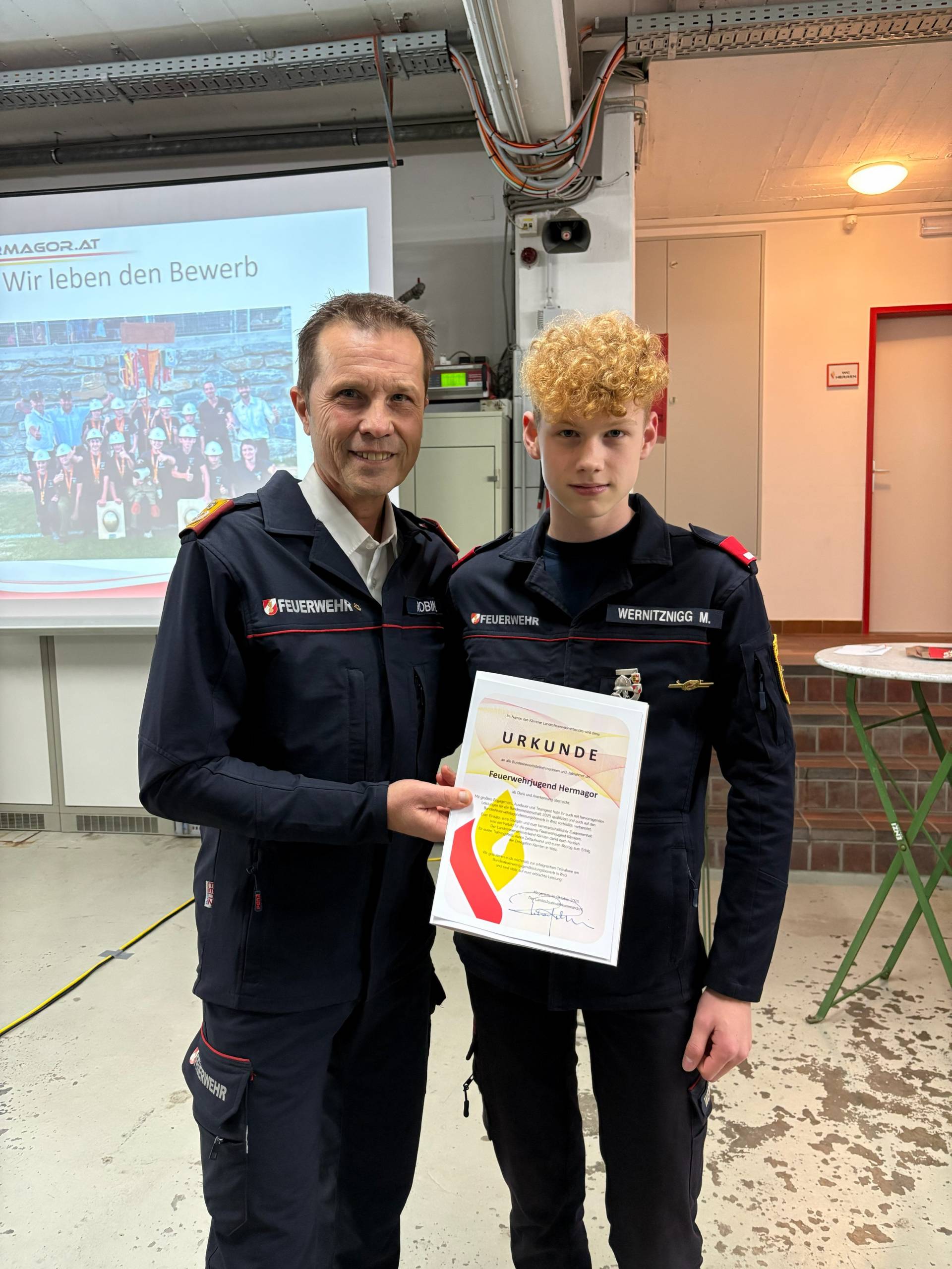 Es war der Abschlussabend der Jugend-Feuerwehr Hermagor und dort gab es für die Jung-Florianis auch eine besondere Überraschung: Landesfeuerwehrkommandant Rudolf Robin kam persönlich, um den jungen Bewerbsteilnehmern seien Dank und Lob auszusprechen und ihnen für ihre tollen Leistungen in der Steiermark eine Ehrung vom Kärntner Landesfeuerwehrverband zukommen zu lassen. Robin lobte ihr Engagement, Ausdauer und Teamgeist und zeigte sich stolz auf die junge Truppe. Der Einsatz, die Disziplin und der kameradschaftliche Zusammenhalt sei ein Vorbild für die gesamte Feuerwehrjugend Kärntens. Im Rahmen dieses Abends gab es zudem noch zwei hohe Auszeichnungen des Österreichischen Bundesfeuerwehrverbandes: Für ihre Verdienste um das österreichische Feuerwehrwesen wurden Gemeindejugendbeauftragten Heinz Wernitznigg und Dietmar Regittnig-Tillian das Verdienstzeichen 3. Stufe des Österreichischen Bundesfeuerwehrverbandes verliehen. An diesem Abend gaben sich auch BFK Herbert Zimmermann, AFK Robert Koppensteiner und Bgm. Leopold Astner mit den Stadträten Wolfgang Wallner und Hannes Burgstaller die Ehre.