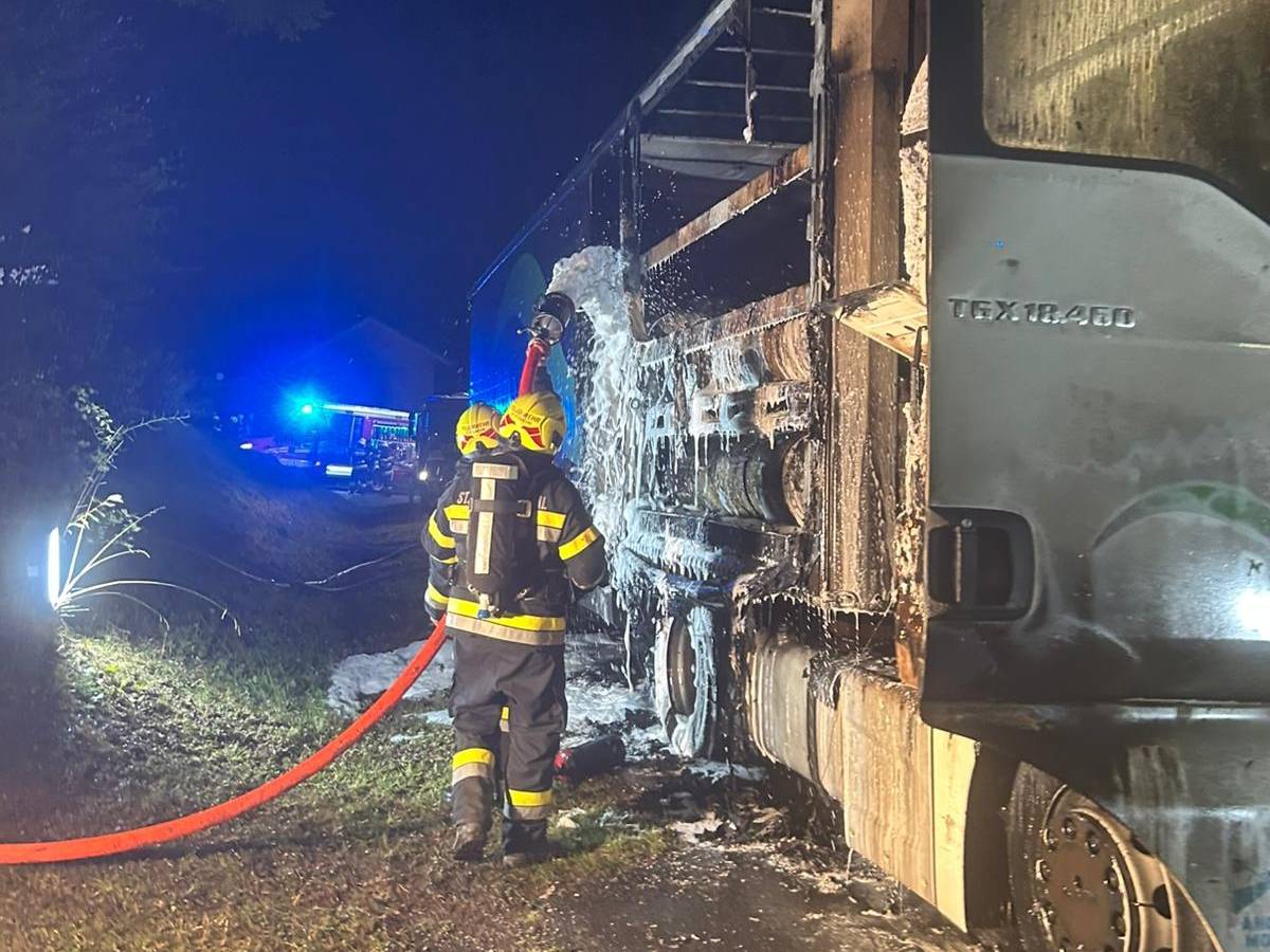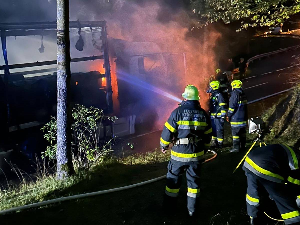 Die bereits alarmierte und kurze Zeit später eingetroffenen FF Matschiedl, Tratten, St. Stefan, Kerschdorf Wertschach, St. Paul und Vorderberg, insgesamt 73 Einsatzkräfte, konnten den Brand rasch löschen. Beim Eintreffen der ersten Einsatzkräfte stand das Zugfahrzeug und ein Teil des Sattelaufliegers bereits in Vollbrand. Durch das rasche Eingreifen mehrerer Trupps unter schwerem Atemschutz konnte die Brandausbreitung auf den restlichen Sattelauflieger und den angrenzenden Wald verhindert werden. Der Lenker des LKW blieb unverletzt. Das Führerhaus brannte vollständig aus. Nach rund 45 Minuten konnte „Brand aus“ gegeben werden. Die Kreuzner Landesstraße (L33) war während der Löscharbeiten für den gesamten Verkehr gesperrt.
