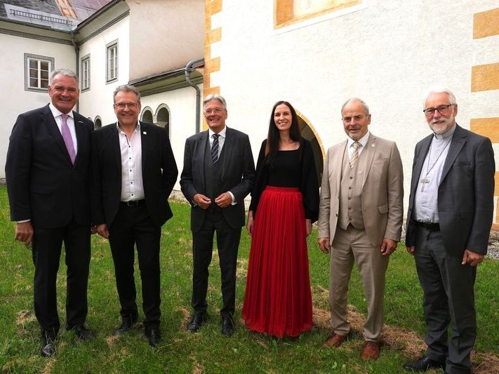 V. l.: Bgm. Alexander Thoma, Josef Pleikner, LH Peter Kaiser, Stefanie Glabischnig, Bernhard Zlanabitnig, Bischof Josef Marketz. Foto: LPD Kärnten/Pleschberger