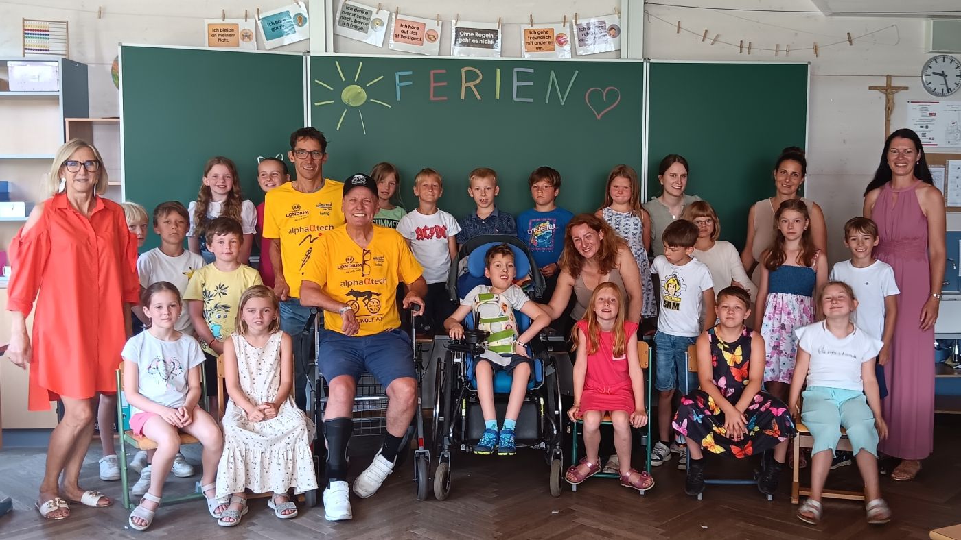 Die beiden Parasportler „Radlwolf“ Wolfgang Dabernig und Michael Kurz waren vor Ferienbeginn in der Volksschule Hermagor, um eine Spende in der Höhe von 2.000 Euro zu Gunsten des kleinen Bendegúz (Mitte) zu übergeben der an Spinaler Muskelnatrophie leidet.