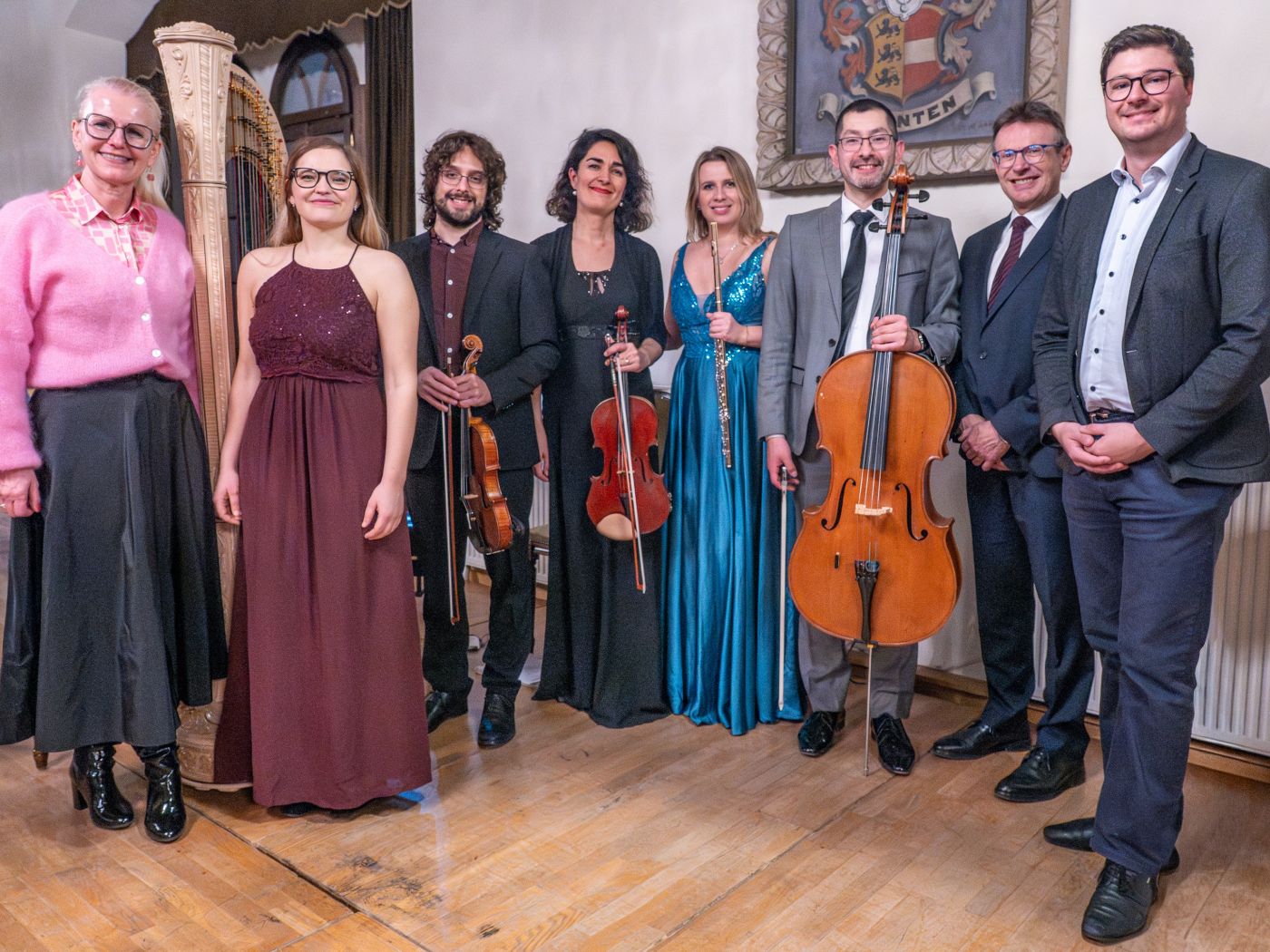 Das Ensemble, gegründet von Jelena Engelhardt (Harfe, Musikschule Spittal/Drau, 2. v. l.) und Aleksandra Pechytiak (Soloflöte, Philharmonie Salzburg, 4. v. l.), verfolgt die künstlerische Vision, musikalische Vielfalt erlebbar zu machen und kulturelle Traditionen miteinander zu verbinden. Diese Idee prägte auch das aktuelle Konzertprogramm. Zentrum des Abends stand Mozarts Doppelkonzert für Flöte und Harfe – mit den beiden Gründerinnen als Solistinnen.
