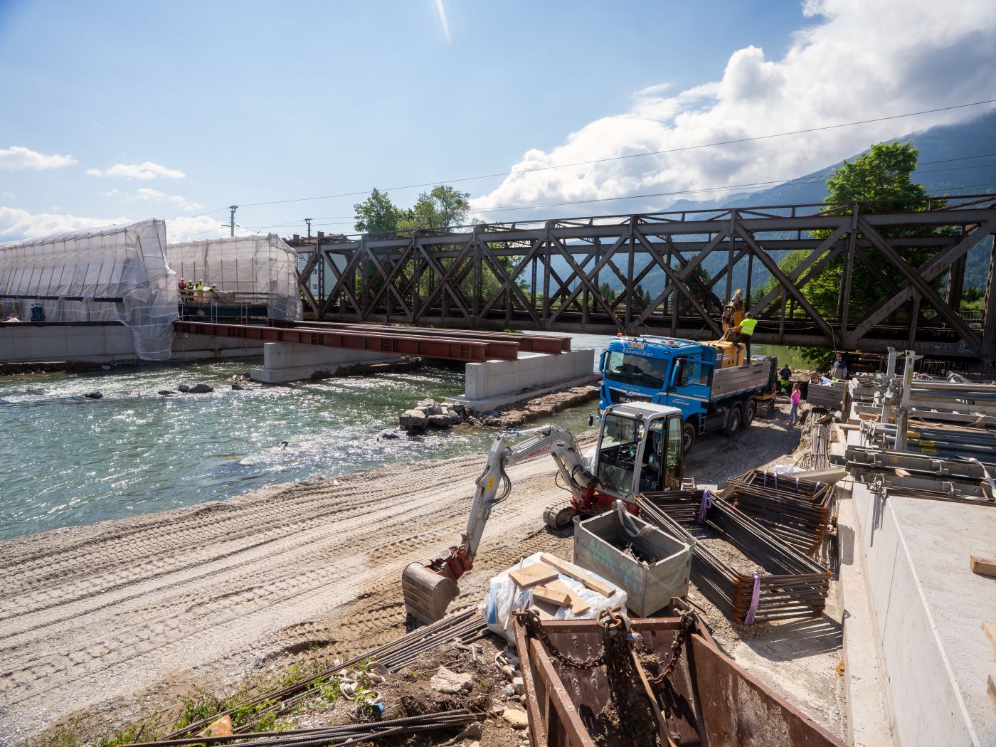 Seit Jänner dieses Jahres laufen die Arbeiten für den Neubau der Brücke auf Hochtouren. In den nächsten Wochen wird das alte Tragwerk der Brücke abgetragen und das auf einem Montagegerüst fertiggestellte neue Tragwerk auf seine neue Lage verschoben. Für die aufwändigen Arbeiten ist eine Sperre der Brücke im Zeitraum von 27. Juni bis 14. Juli notwendig. Der Schienenersatzverkehr auf der Tauernstrecke, der derzeit mit Direktbussen von Schwarzach nach Spittal unterwegs ist, wird in diesem Zeitraum bis nach Villach geführt. Die Verkehrsfreigabe der Brücke fällt mit dem Ende der Tauernsperre am 14. Juli zusammen.