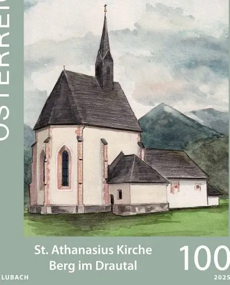 Die eindrucksvolle St. Athanasius-Kirche (St. Athanas) in Berg im Drautal ist Motiv für eine Briefmarke der Post und erfährt damit eine weitere Bekanntheit. Doch erst am 20. Juni 2025 ist es soweit: Die Österr. Post AG verausgabt auf Anregung des Österreichischen Philatelistenvereins St. Gabriel im Rahmen der Sondermarkenserie „Kirchen in Österreich“ eine Briefmarke mit dem Motiv der Filialkirche St. Athanasius (St. Athanas).