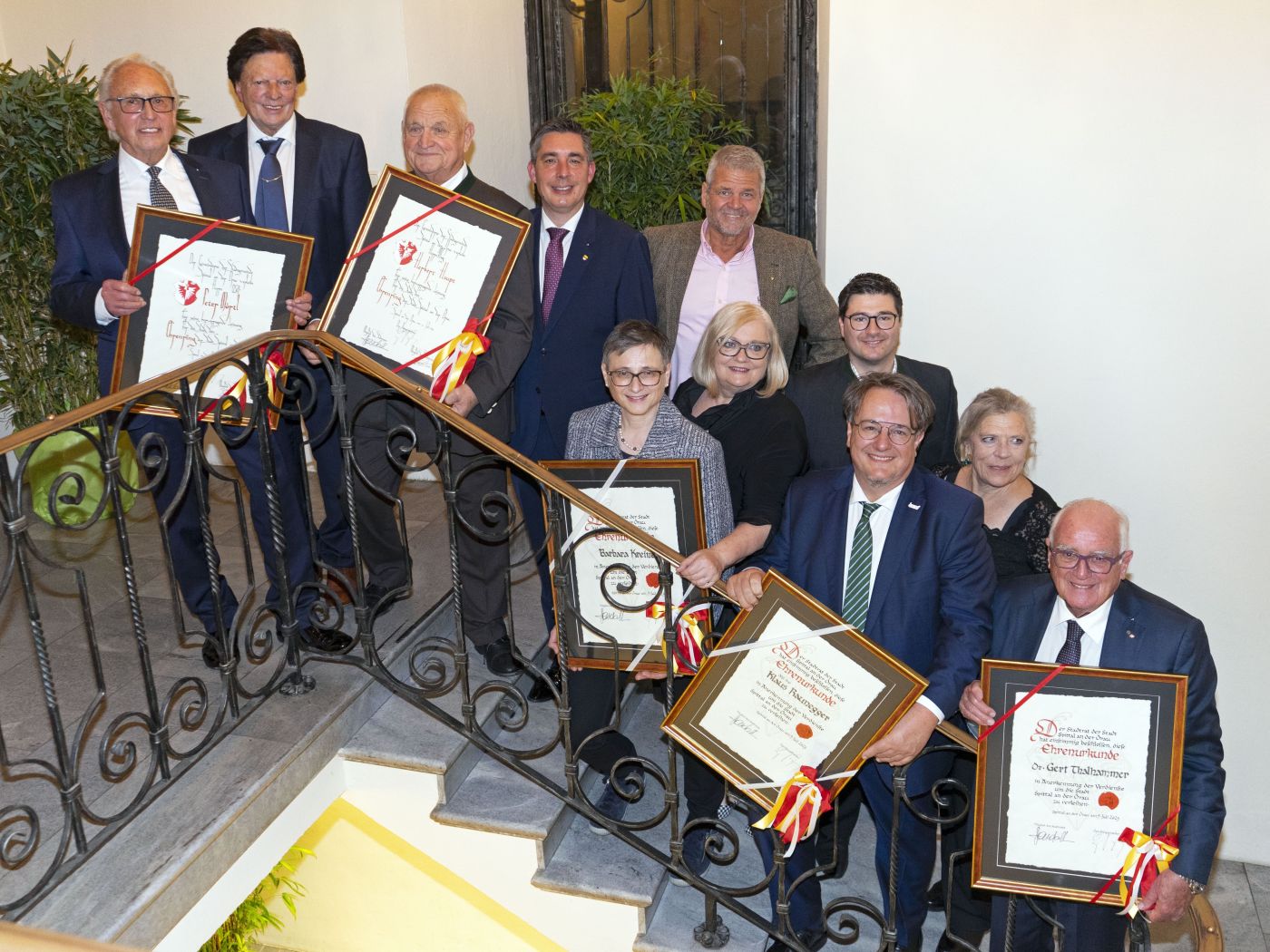 Drei weitere verdiente Spittaler Persönlichkeiten wurden in diesem Zuge mit Ehrenurkunden gewürdigt: DI Klaus Raunegger, MBA, Barbara Kreiner und Dr. Gert Thalhammer. Klaus Raunegger hat 1996 als junger Absolvent der technischen Chemie die Produktionsleitung der Firma Merck übernommen und baute das Werk mit innovativer Technologie und unternehmerischer Weitsicht aus. Als Mitglied der Industriellenvereinigung Kärnten mitbegründete er das Regionalforum Oberkärnten zur besseren Vernetzung von Wirtschaft, Bildung und Gemeinden. Besonders hervorzuheben ist auch sein Einsatz bei der Etablierung eines HTL-Zweigs an der HAK Spittal. Barbara Kreiner prägt seit mehr als drei Jahrzehnten mit der Kulturinitiative „LiteraturPur“ das kulturelle Leben der Stadt mit. Gleichzeitig führt sie in vierter Generation die traditionsreiche Buchhandlung Nest am Hauptplatz, die seit 1895 fester Bestandteil der Spittaler Innenstadt ist. Gert Thalhammer widmet sich als Präsident der Dante Alighieri Gesellschaft Spittal-Millstätter See seit über vier Jahrzehnten der Pflege der italienischen Sprache und Kultur. Unter seiner Leitung wuchs die Mitgliederzahl auf knapp 1.200 Personen.