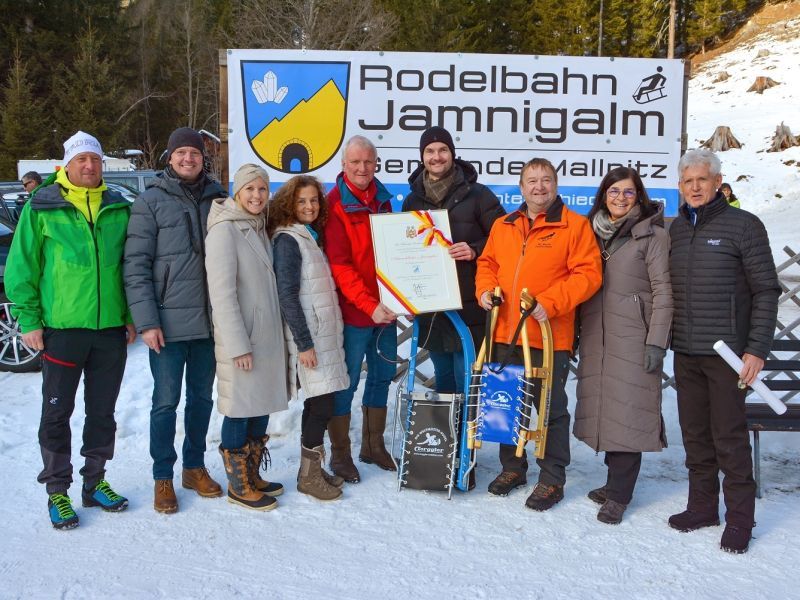 Vor der Winter-Kulisse im Mallnitzer Tauerntal ging die feierliche Überreichung des Naturrodelbahn-Gütesiegels für die Rodelbahn „Jamnigalm“ über die Bühne.