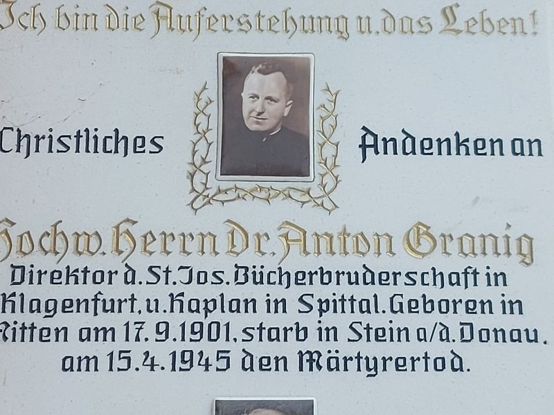 Der aus dem Mölltal stammende Priester Dr. Anton Granig (1901 – 1945) leistete Widerstand gegen den Nationalsozialismus und wurde am 15. 4. 1945 in Stein an der Donau erschossen. Dr. Hemma Unterluggauer (eine Nichte von Dr. A. Granig) und der Priester und frühere Pfarrer Josef Granig (ein Neffe von Dr. A. Granig) haben anlässlich des 80. Todestages eine Gedenkschrift herausgegeben.