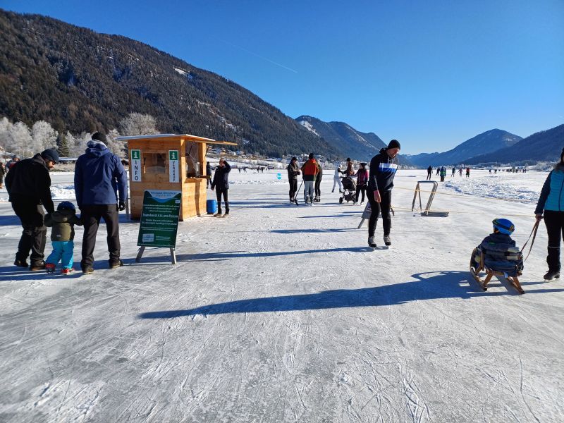 Die Natureisfläche am höchsten Badesee der Alpen lockt schon mit oberflächlich geschlossener Eisfläche, doch zum Eislaufen ist der Weißensee noch nicht freigegeben.