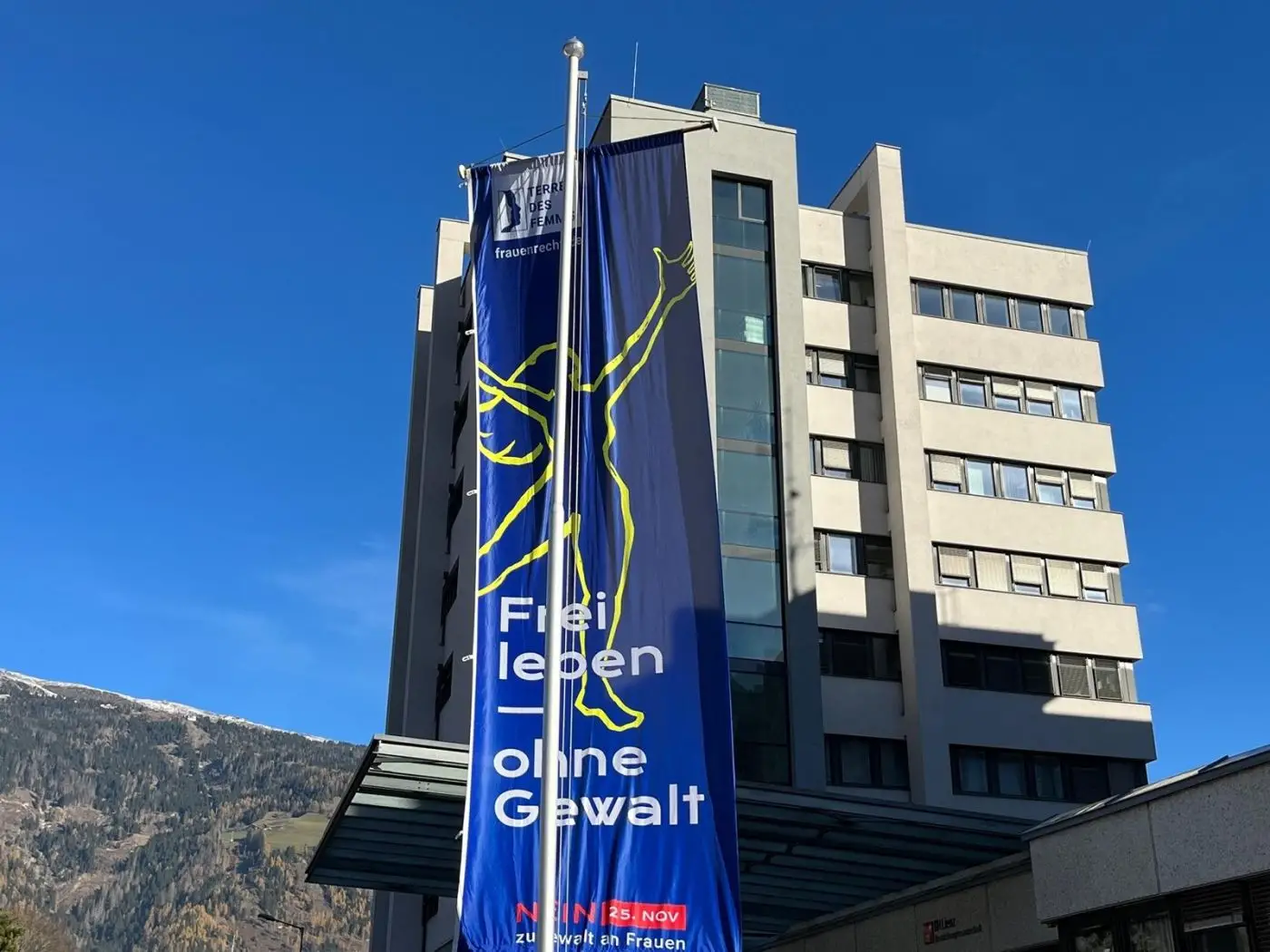 16 Tage lang wehen die Flaggen gegen Gewalt an Frauen auf dem Johannesplatz und erstmals auch vor der Bezirkshauptmannschaft.