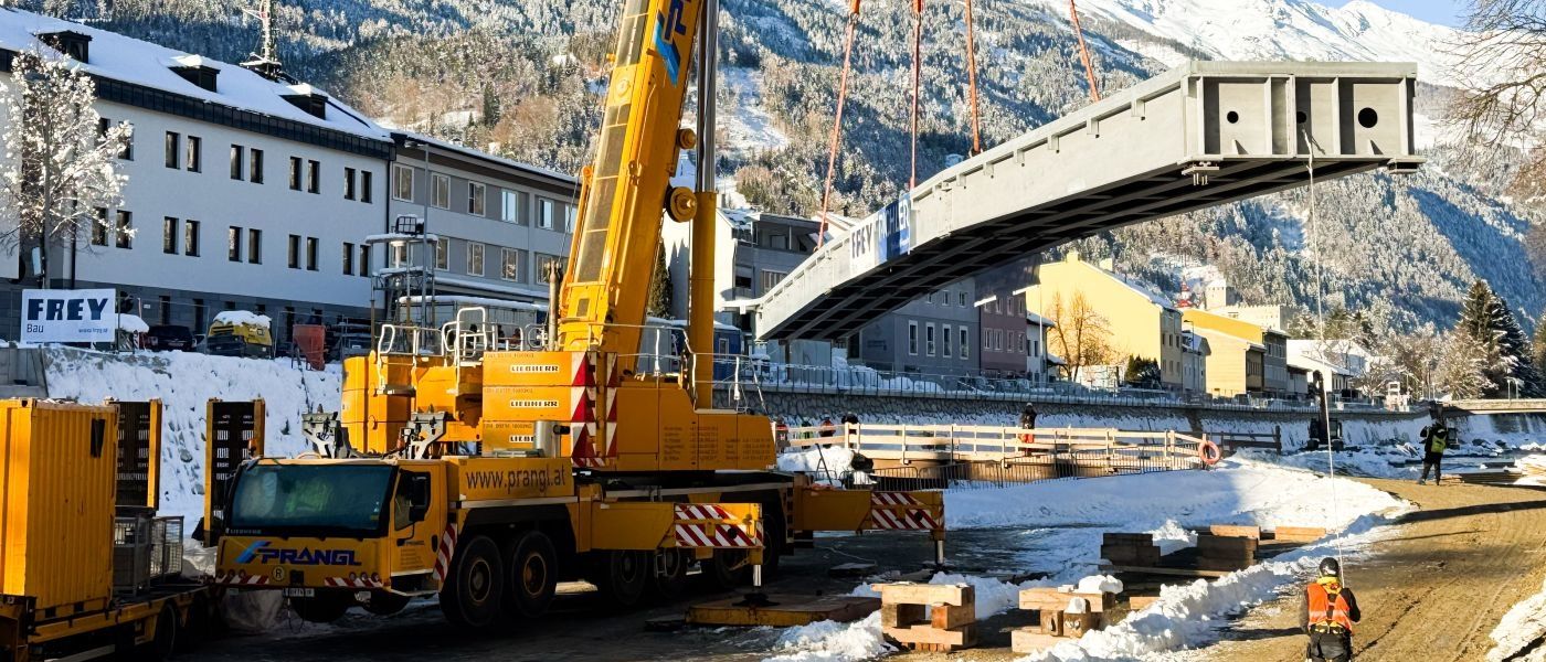 Die Arbeiten am Iselsteg in Lienz sind heute einen wichtigen Schritt weitergegangen. Auf der Baustelle wurde ein zentrales Brückenelement eingehängt und eingebaut, das die Isel von einem Ufer zum anderen überspannt.
