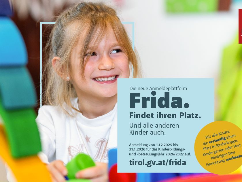 Wer ab Herbst 2026 einen Betreuungsplatz in einem Kindergarten, einer Kinderkrippe oder einem Hort braucht, kann sich ab 1. Dezember online dafür anmelden. Am 1. Dezember startet in Tirol die neue Plattform FRIDA und damit auch das Recht auf Vermittlung eines Betreuungsplatzes für Kinder ab 2 Jahren. Dazu Landeshauptmann Anton Mattle: