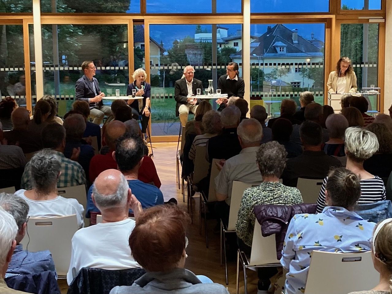 Am Podium im Bildungshaus diskutierten Dekan Franz Troyer, Zeitzeugin Erika Pätzold, Gottfried Kalser (Vizeleutnant i.R. und Initiator von Erinnerungsprojekten) und Historiker Martin Kofler mit dem Publikum. Moderiert wurde die Veranstaltung von Monika Reindl (BHO-Leiterin). Foto: Stangl