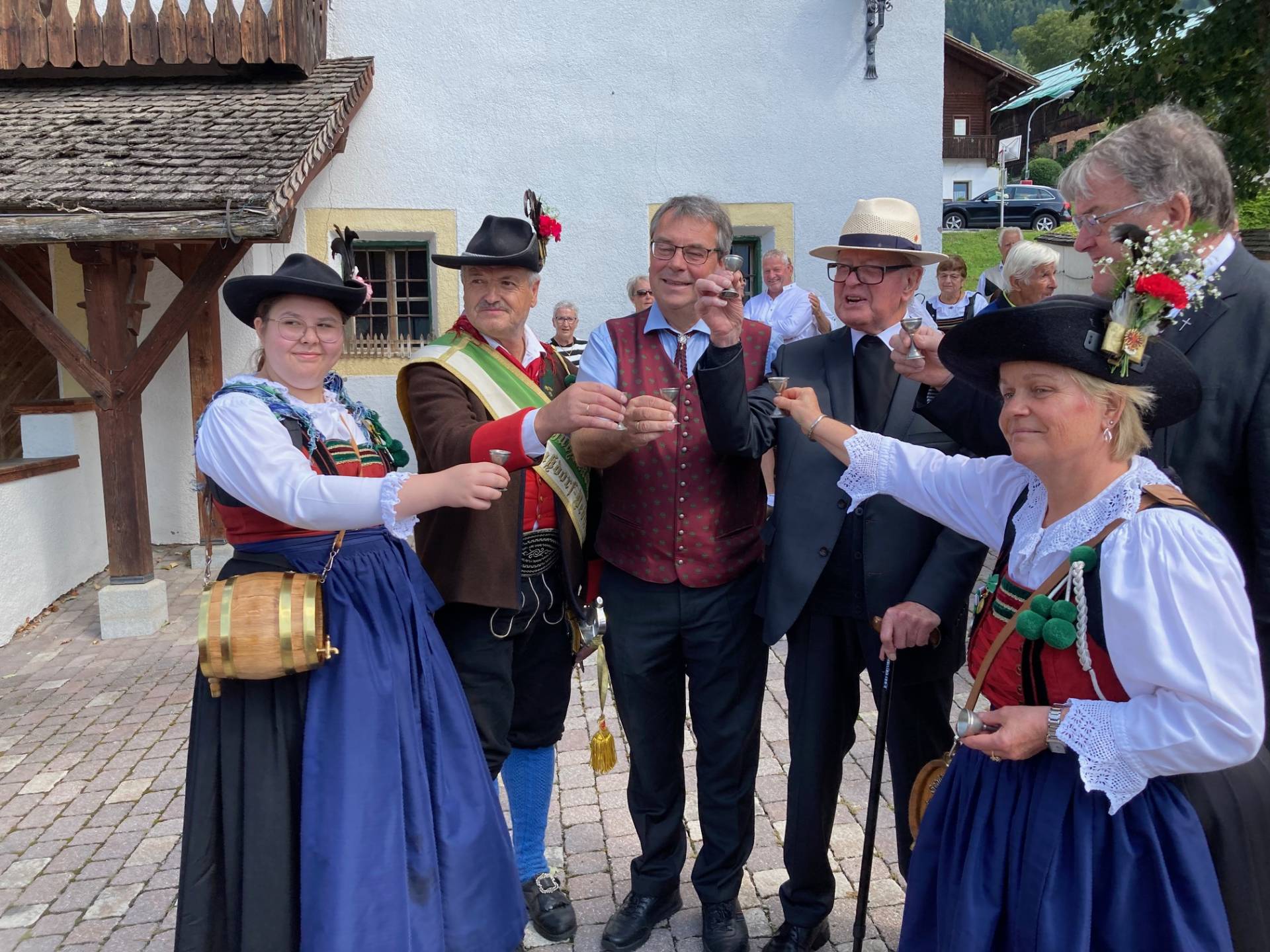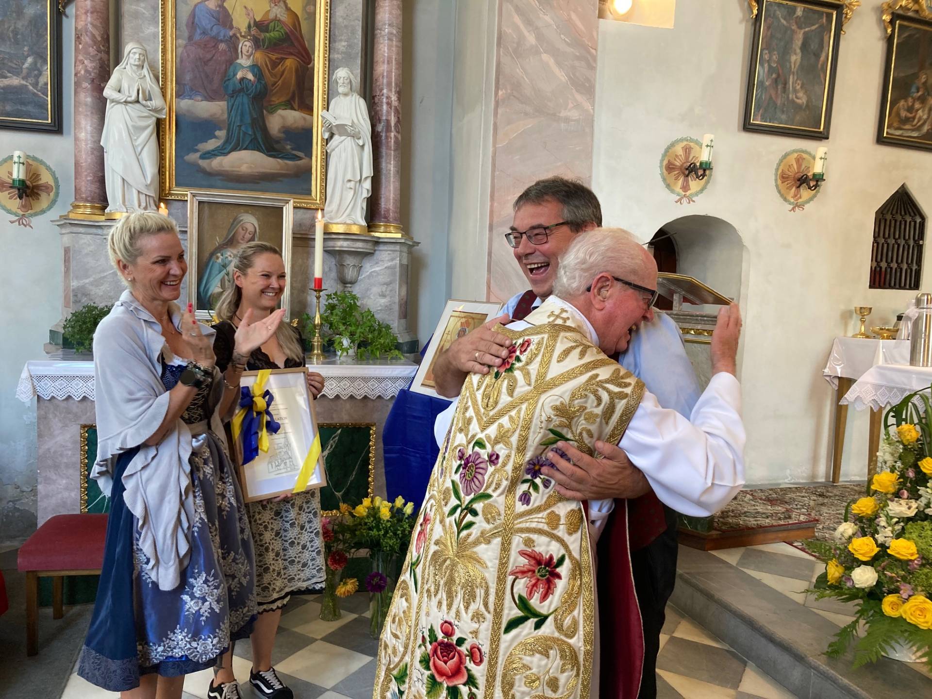 Ein großer Chor umrahmte die Festmesse in Nußdorf musikalisch, Ministranten, Pfarrgemeinderat und Gemeinde bedankten sich für den unermüdlichen Einsatz. Von der Schützenkompanie gabs eine Ehrensalve und vom Chor „A Liadl für di“