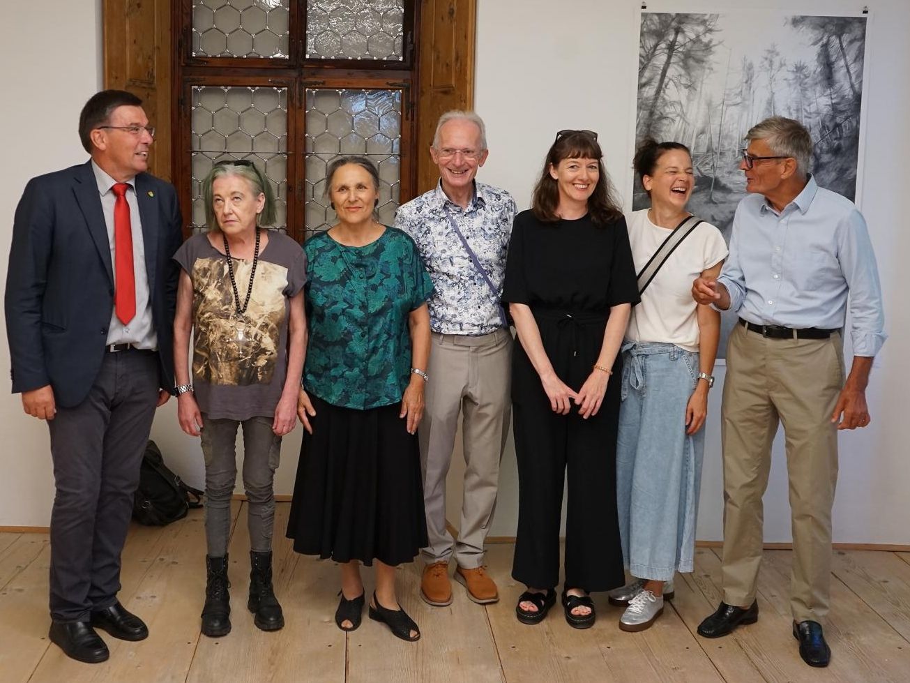 Die anwesenden Künstlerinnen Ilse Pfeifhofer, Hannelore Nenning, Alexandra Kontriner und Ursula Mairamhof-Biechl mit Bürgermeister Johann Waldauf, Kurator Erich Lexer und Gottfried Unterweger bei der Ausstellungseröffnung im Pfleghaus Ende Juni. Foto: Pfleghaus Anras