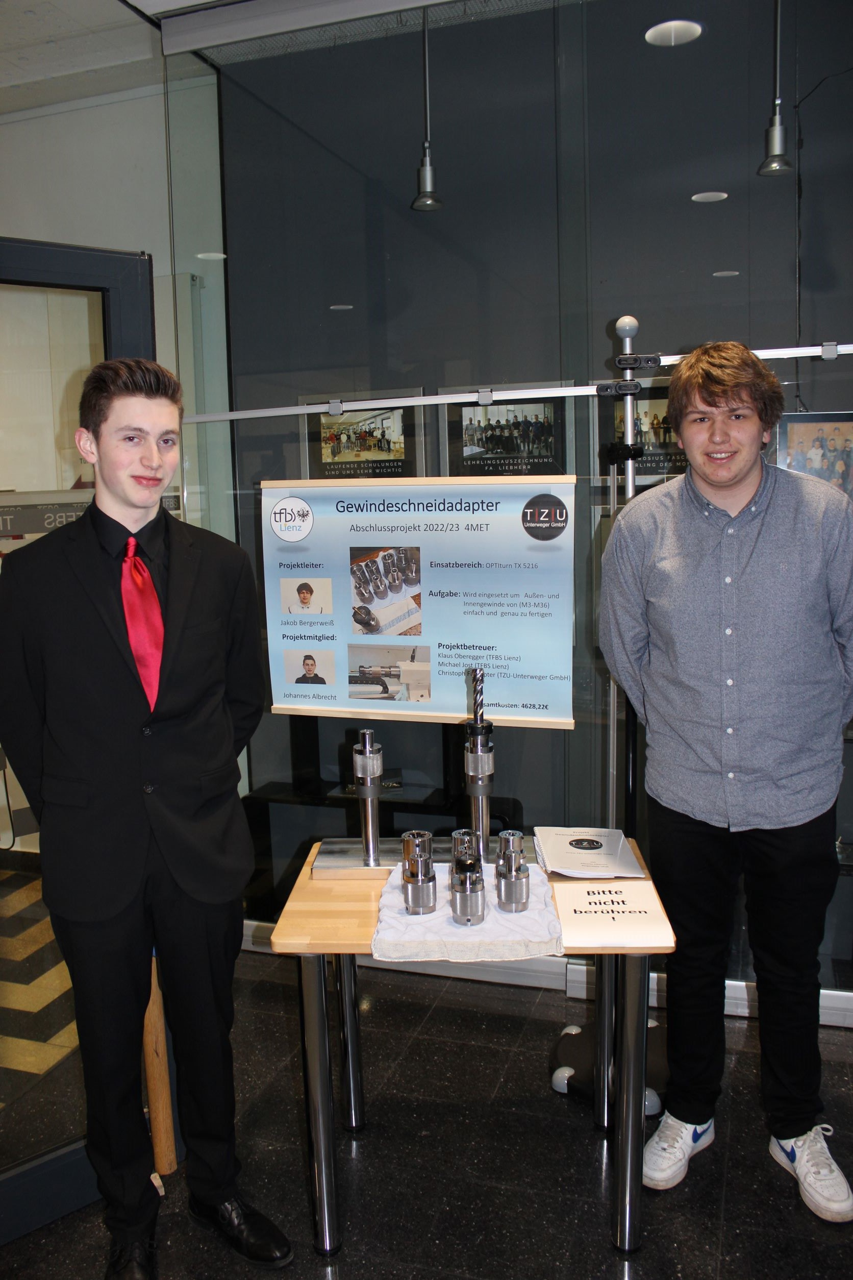 Die beiden Lehrlinge Jakob Bergerweiß und Johannes Albrecht (Lehrbetrieb TZU) fertigten gemeinsam einen Gewindeschneidadapter für ihren Lehrbetrieb an. Der Gewindeschneidadapter wurde entwickelt, um Innen- und Außengewinde von M3-M30 einfach, präzise und