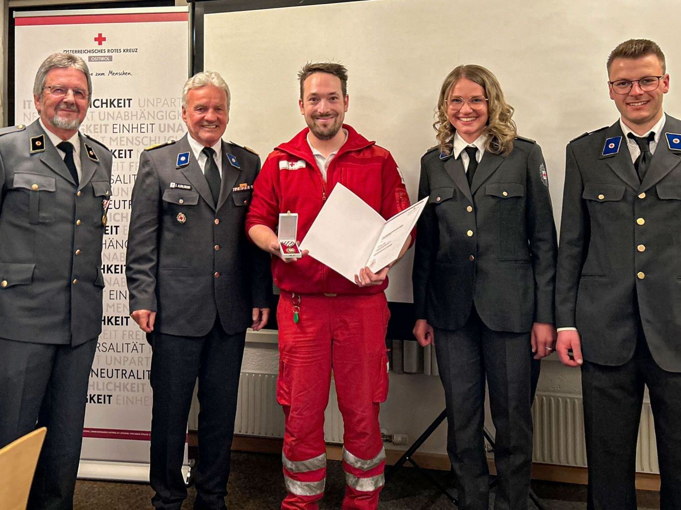 Rotkreuz-Arzt Dr. Ottokar Widemair, Bezirksstellenleiter Egon Kleinlercher, Christoph Müller, Ortsstellenleiterin Valentina Erlsbacher, Ortstellenleiter Stv. Marzell Veiter, Fotos: ÖRK
