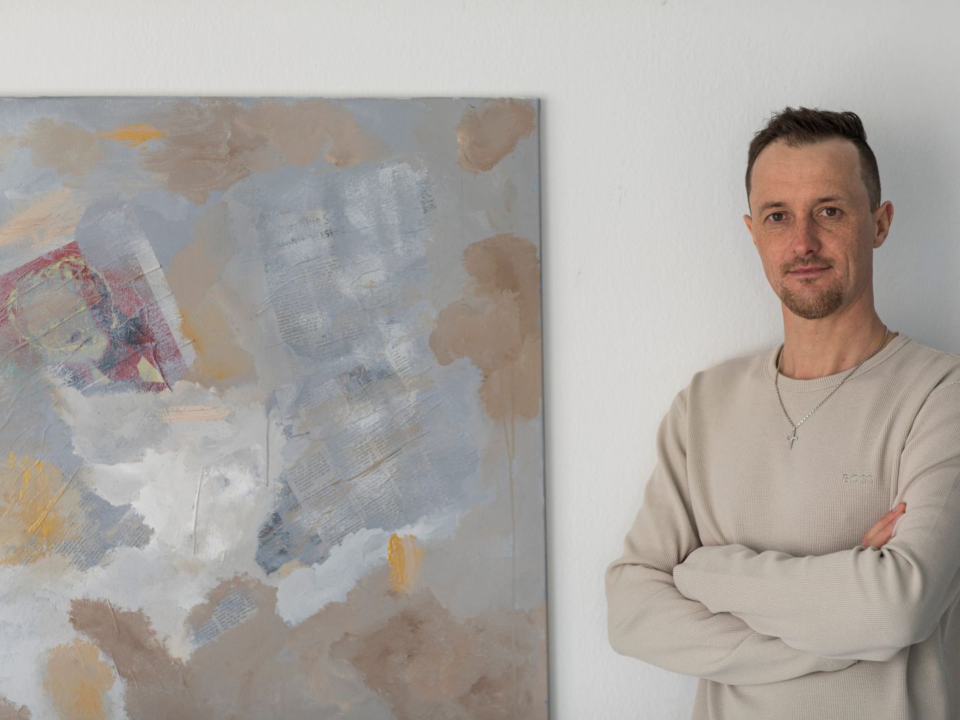 „Wer sich eine spannende Geschichte von endlich erfüllten Kindheitsträumen erwartet, den muss ich enttäuschen. Mich hat Kunst nie interessiert. Ich kann mich nicht erinnern, dass ich als Kind je gemalt hätte. Ich spielte nur mit Traktoren“, sagt Dave Gomig, der im elterlichen Forstbetrieb arbeitet, vor zwei Jahren aber ein einschneidendes „Erlebnis“ hatte. Bei einem Besuch im Baumarkt landete plötzlich eine Leinwand im Einkaufswagen. „Dann hab´ ich es einfach probiert. Es hat mich so fasziniert – obwohl ich keine Ahnung hatte, was ich tue. Die Farben, das Kreative…“ Es hatte ihn gepackt: Einfach nichts zu denken. Nur Emotionen einen Raum zu geben. Denn davon gab es genügend zu verarbeiten: Zwei gute Freunde von Dave Gomig hatten sich das Leben genommen. Ein Onkel war bei einem Arbeitsunfall tödlich verunglückt.