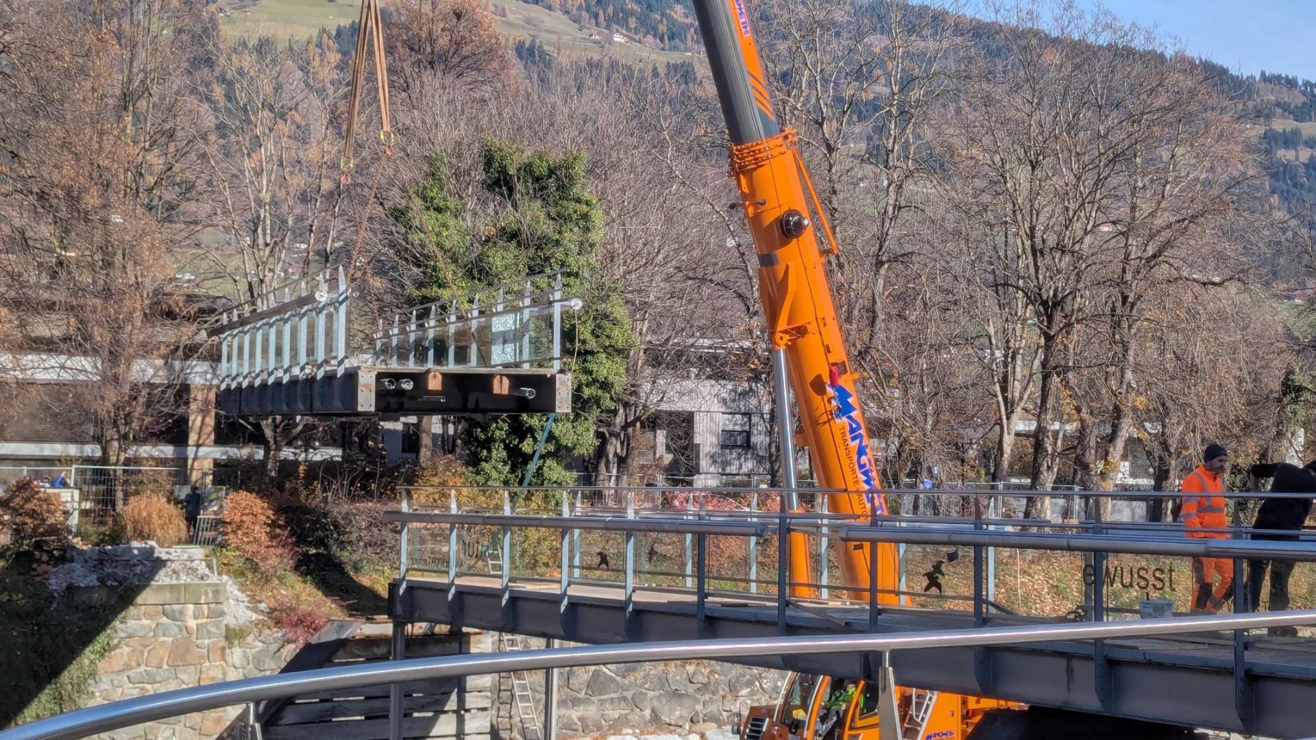 Der Iselsteg verschwindet. Die ersten Brückenelemente wurden am Mittwochvormittag abgebaut.