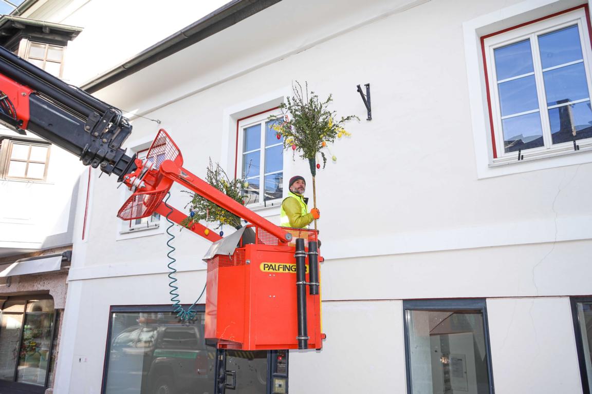 In der Lienzer Innenstadt ist der Frühling eingezogen. Am Donnerstag waren die Mitarbeiter der Stadtgemeinde Lienz unterwegs, um die Messinggasse und die Kreuzgasse mit Palmbesen zu dekorieren.