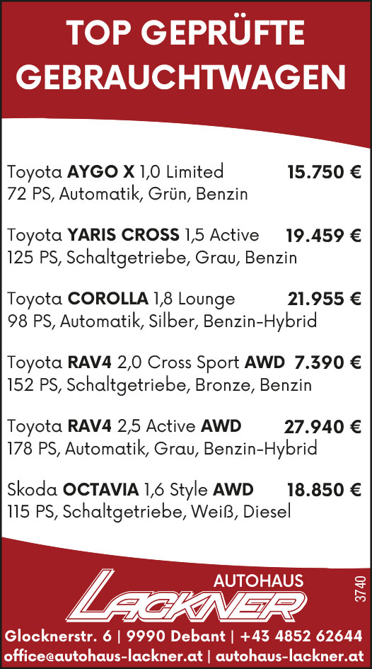 Vermiete schöne Wohnungen in Oberlienz + Lienz, 15 - 151 m2, inkl. BK + HK exkl. Strom, FP/Carport teils vorhanden, sowie Lift, Balkon/Loggia/Terrasse. 4 BM Kaution. Tel. 0676-9561120.