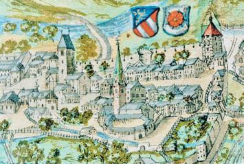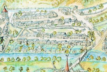 Die „Vorstädte“ Schweizergasse (vorne) und Meraner- bzw. Messinggasse; gut zu erken-
