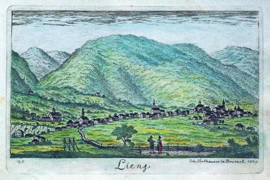 Die Stadt Lienz von Südwesten, kolorierter Kupferstich von Johann Tinkhauser in Bruneck, 1829. Rechts vorne ist deutlich der Ver-