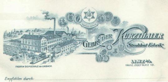 Alter Firmendruck der Strohhutfabrik „GEBRÜDER KURZTHALER“ mit Ansicht der Produktionsstätte in Domˇzale (Domschale).