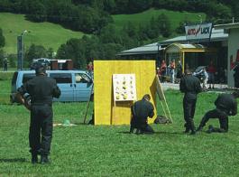 v. l.: Polizist im Hintergrund, Türschnalle beim Auto, Teller auf Holztafel,
