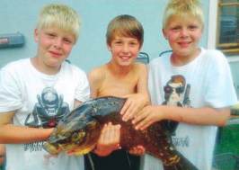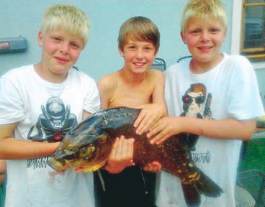 Stolz auf den prächtigen Karpfen sind die jungen Fischer Tobias