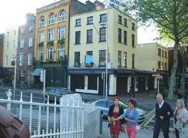 v. l.: Verkehrsschilder, Gitterstab, Geschäftsschild, Fahne am Laternenmast, Ampel