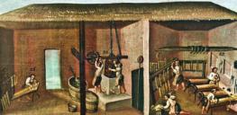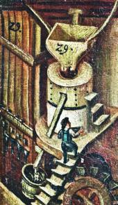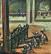 Ausschnitte aus dem Gemälde über die Produktionsstufen der Messingherstellung (von