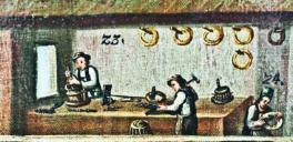 schmieden (11), im Hintergrund Glühherde (13, 14) – Wie die Schaber das Messing auf-
