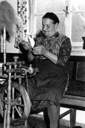 Abb. 8: Johanna Kurzthaler, Mutter von Hans, am Spinnrad, 1968.