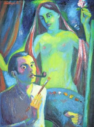 1952: Selbstbildnis mit Akt; Öl auf Leinen, auf Platte montiert, 100 x 73 cm;