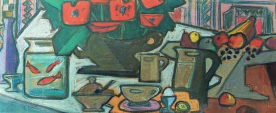 1964: „Stillleben mit Goldfischglas und Mohnblumen“; Tempera/Pastell auf Karton, Passepartout-Ausschnitt 24 x 58,8 cm; bez. links