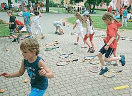 V. l.: Tennisball, T-Shirt, Person im Hintergrund, großer Ball, Armbanduhr