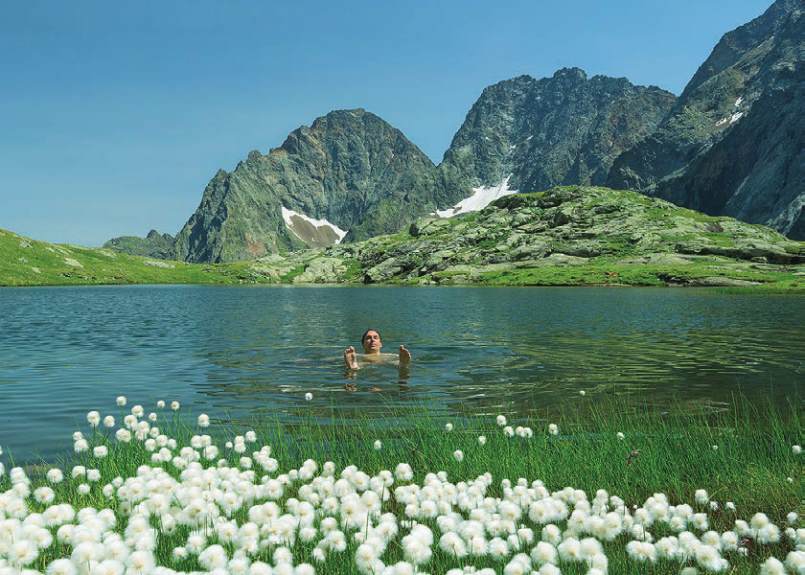 von leuchtendem Wollgras: ein einzigartiges Schwimmerlebnis bei 22 Grad in einem einsamen Hochgebirgssee