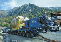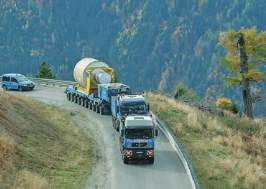 Zugmaschinen mit insgesamt 1.850 PS über 15 enge Kehren zu Europas höchstgelegener Wasserkraftwerks-