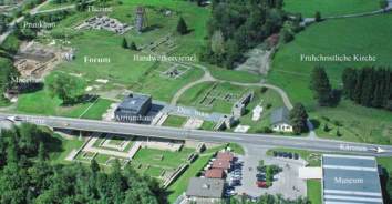 Hubschrauberaufnahme von Aguntum mit den wichtigsten Bauten; Aufnahme aus süd-