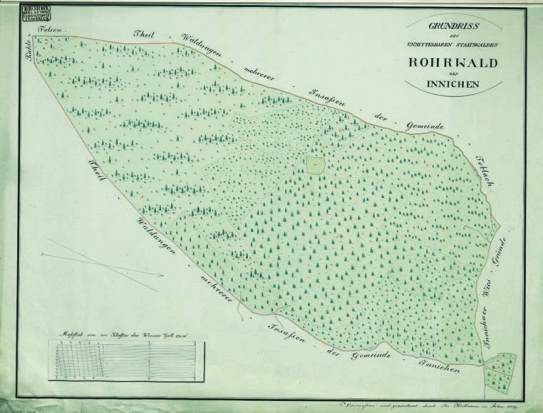 Situationsplan des Staatsforstes „Rohrwald“ im Bereich Innichen, 1827/28.