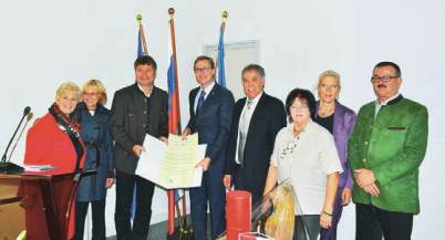 Nach der Unterzeichnung: StR Renate Egger, Vize-Bgm. Lili Stefanic (Gottschee), die Bürgermeister