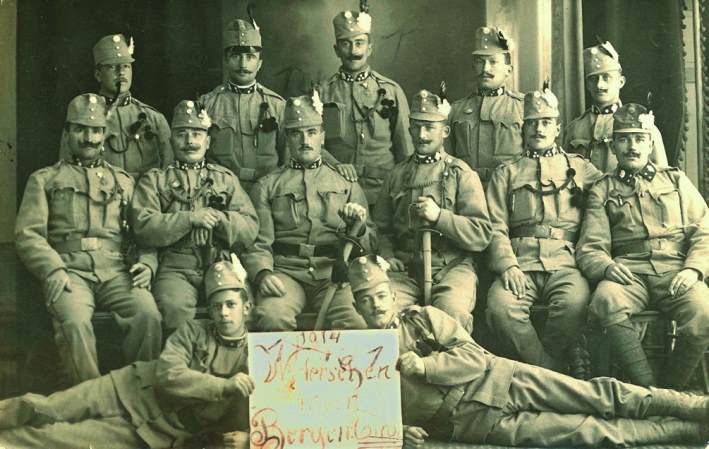 Gruppenfoto von Landesschützen mit einer Tafel „1914 Wiedersehen in den Bergen