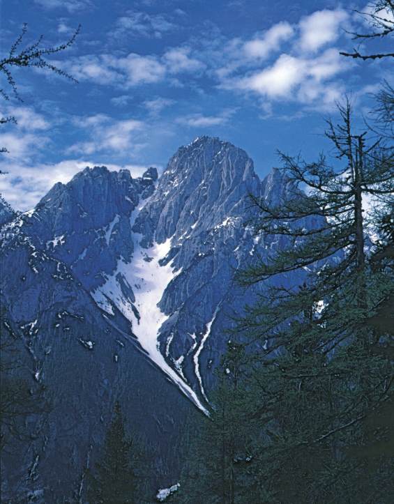 Blick zum Spitzkofel (2.718 m) mit Arlingriese, von der eine Schneerinne
