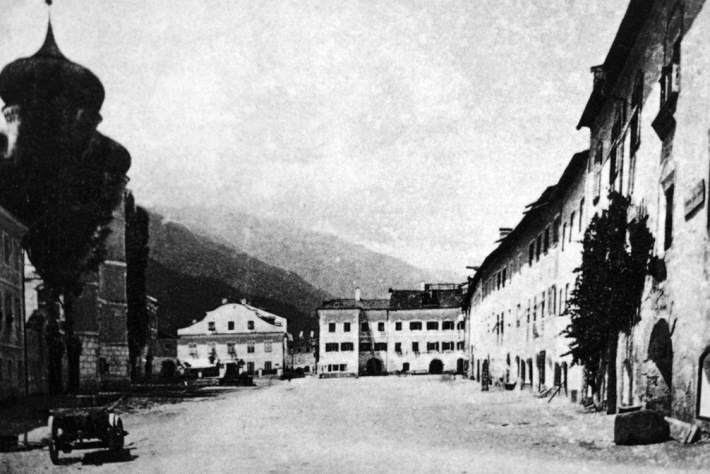Der Untere Stadtplatz in Lienz, um 1880; im Hintergrund, rechts, Hotel „Post“, in dem